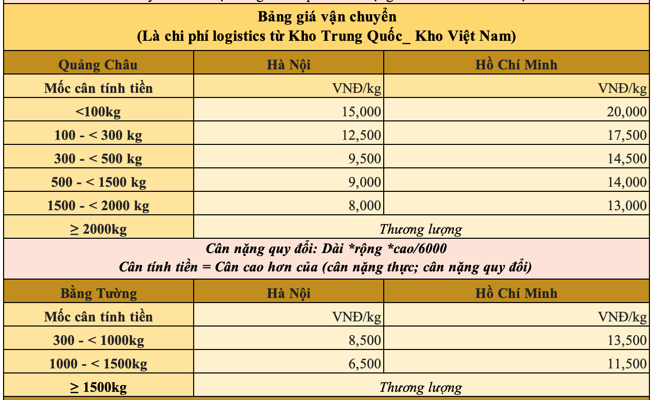 BẢNG GIÁ VẬN CHUYỂN
