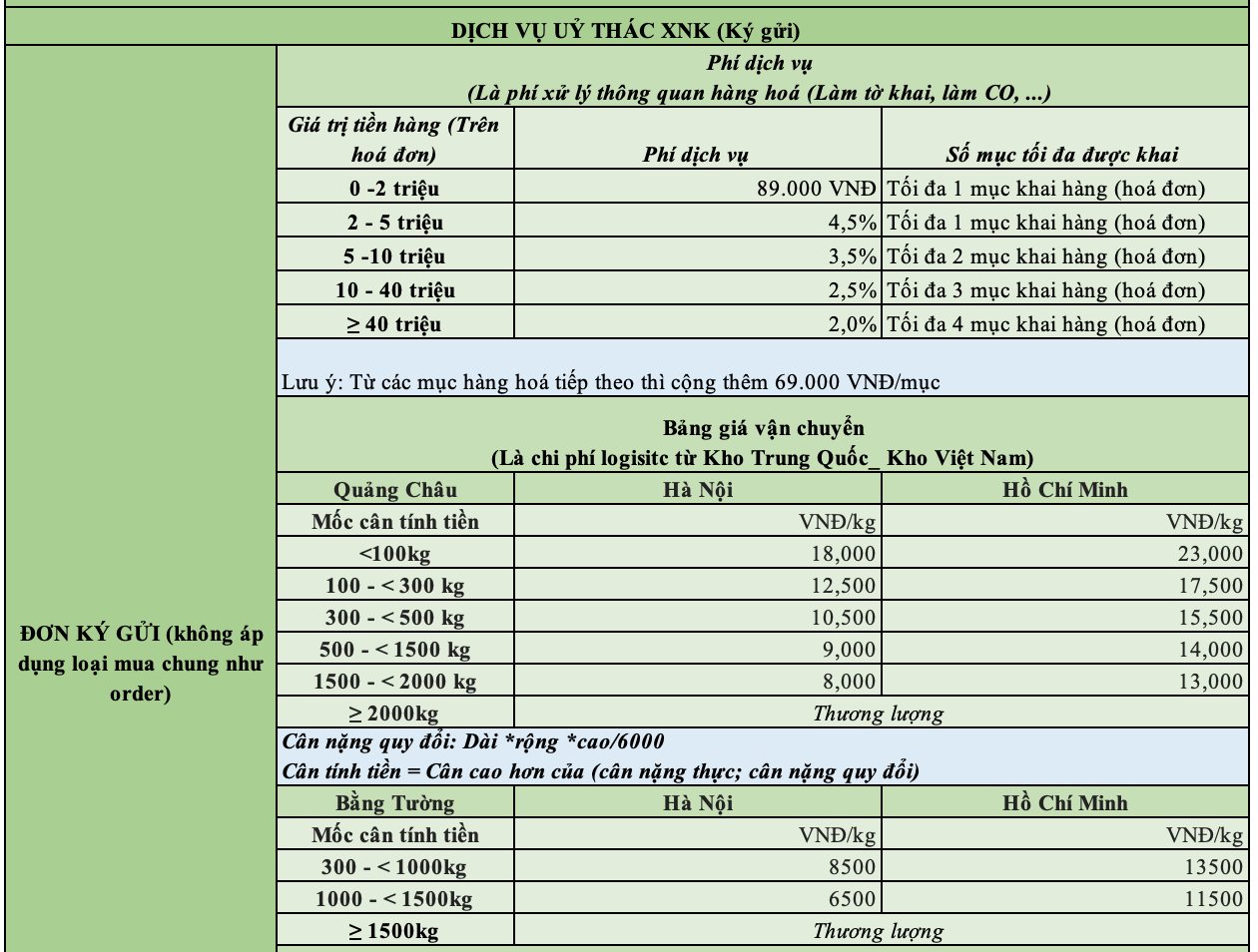 Phí đóng kiện gỗ và chống sốc: Để đảm bảo an toàn cho hàng dễ vỡ, dễ biến dạng hoặc có giá trị cao trong suốt quá trình vận chuyển, khách hàng có thể lựa chọn sử dụng dịch vụ đóng kiện gỗ. Mức phí tính theo thể tích hàng hóa.